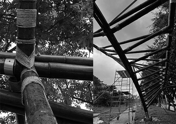 因此在設計上希望採用台灣傳統的竹包管作法,減少竹子的螺栓穿孔行為,以防止竹子穿孔過多之後發生劈裂破壞。由於三角管內部每根桿件的角度皆不同,因此在各個方向上均有形抗的作用,維持了整個形狀的穩定性。